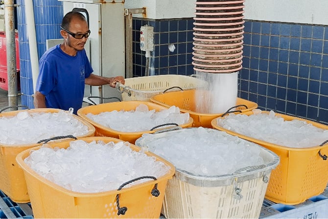 また、販売事業の加工品や漁で使用する餌などを保管する低温冷凍庫を2棟4室保有しています。さらに、出漁に使用する氷や水揚げした魚を箱詰め出荷する際に使用する氷などを供給する大型製氷機を3機保有し、氷の使用量に合わせて適宜稼働させています。